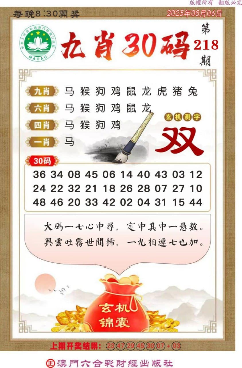 正澳门六合彩【218期】九肖30码